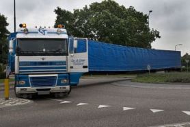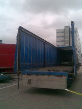 Ook hebben we een huifoplegger van 13,60 meter. Het dak kan verhoogd worden, zodat er b.v. een container